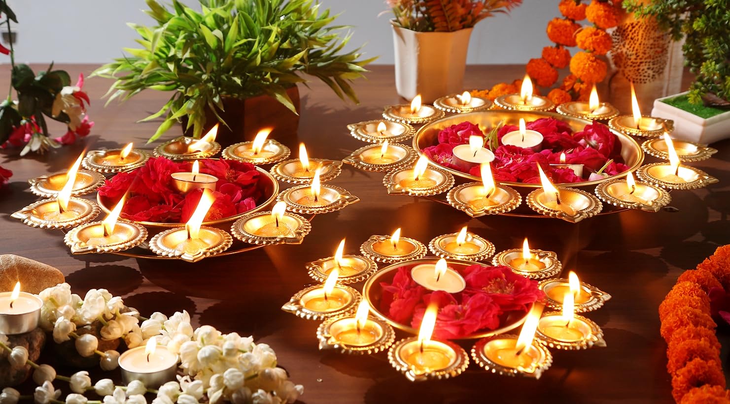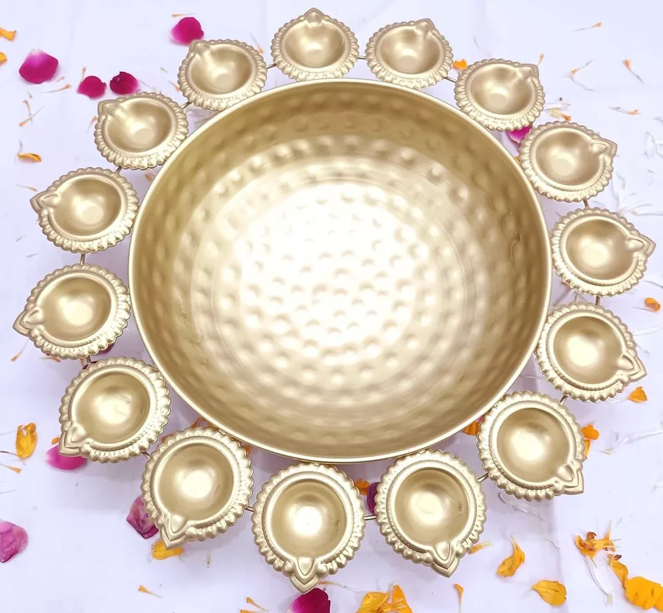Our Urli Bowl is designed to bring warmth and ambiance to any room. The golden color and round shape give a traditional and luxurious look, perfect for indoor decor. Use it to create a peaceful atmosphere in your living room, bedroom, or dining room.